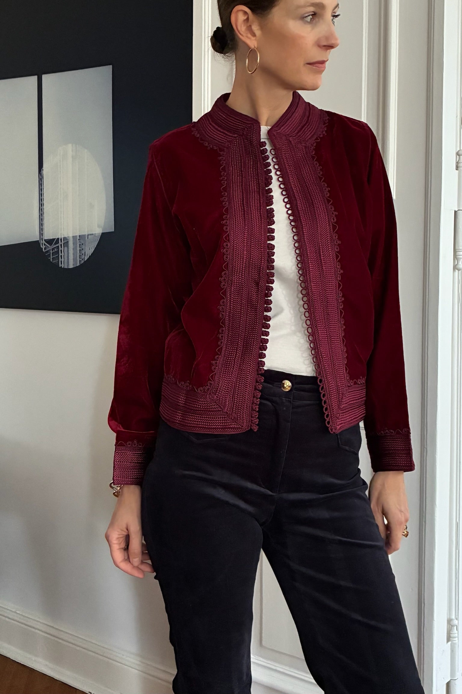 NOUÏKKA’s Bolero velvet jacket Helena is handmade in Marrakech and features intricate Moroccan silk embroidery. Cut slightly slimmer and more fitted than our other models, it offers a flattering silhouette that pairs beautifully with skirts or wide-leg trousers. A refined stand-up collar adds a touch of elegance.